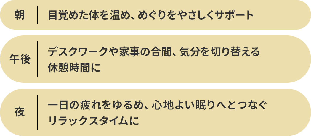 朝の目覚めに、夕食の前に、リラックスしたい時など、生活習慣に取り入れやすいお好きなタイミングでいつでもお召し上がりいただけます。 -